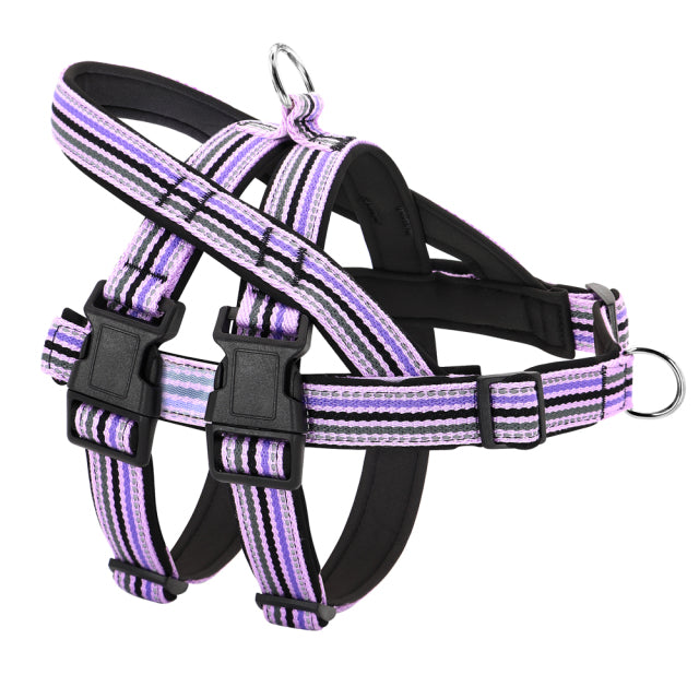 Made from high-quality nylon material, this harness is durable and long-lasting. The padded design ensures that your furry friend stays comfortable, even during long walks or training sessions. The harness is available in three vibrant colors - blue, pink, and purple - allowing you to choose the one that suits your dog's personality.
