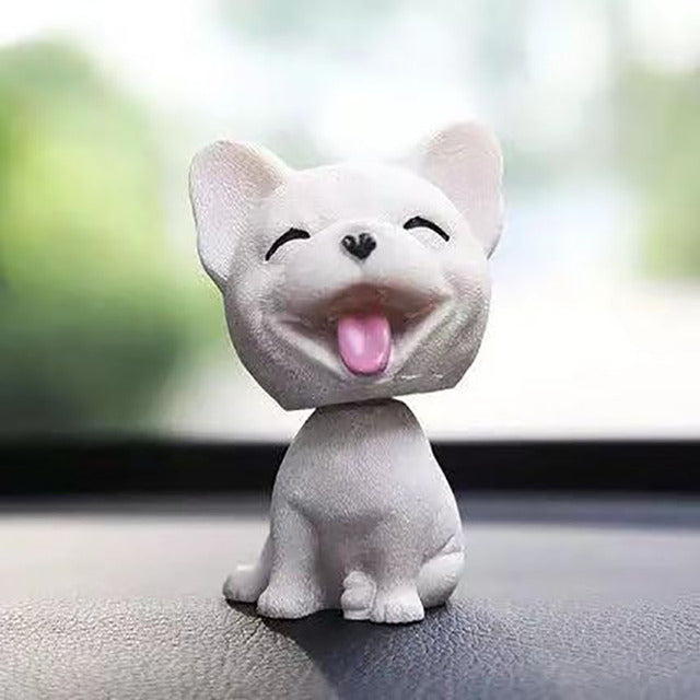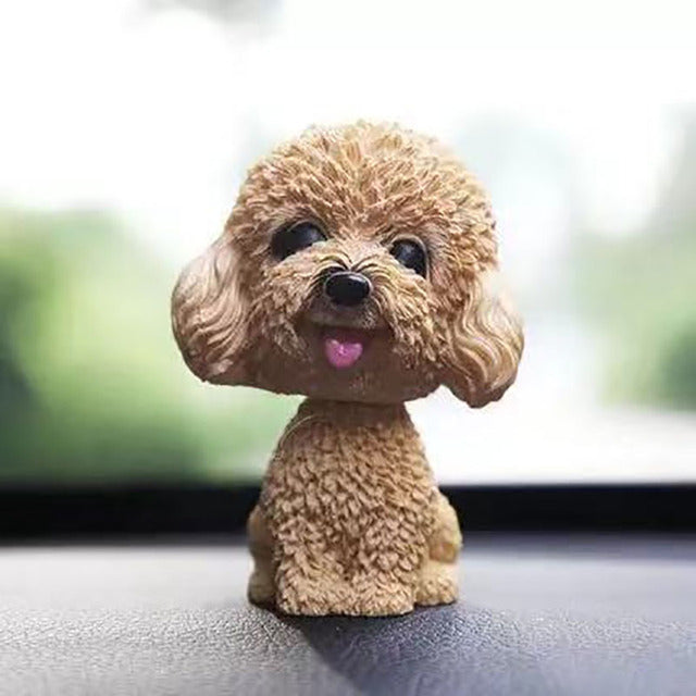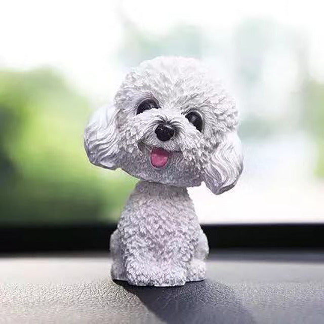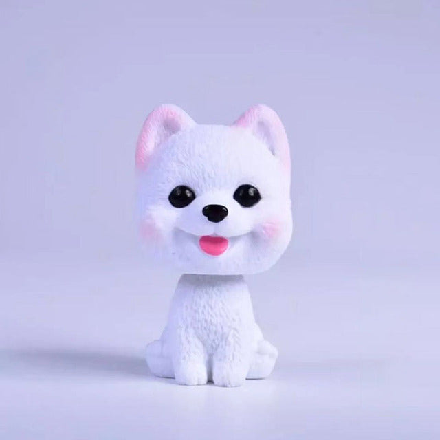 A car ornament in the form of a shaking head dog that can be used to decorate car dashboards or rooms. The ornament comes in three breeds - Husky, Teddy, and Pomeranian and is made of resin with a weight of 80g