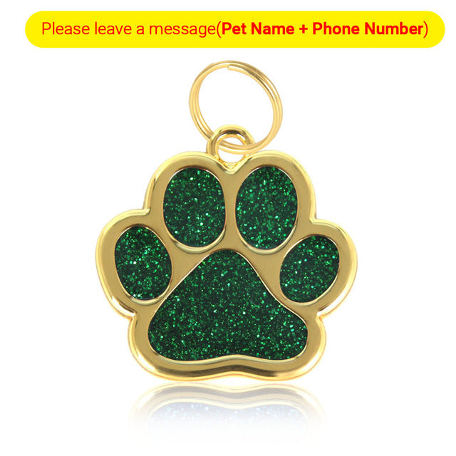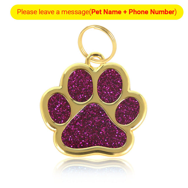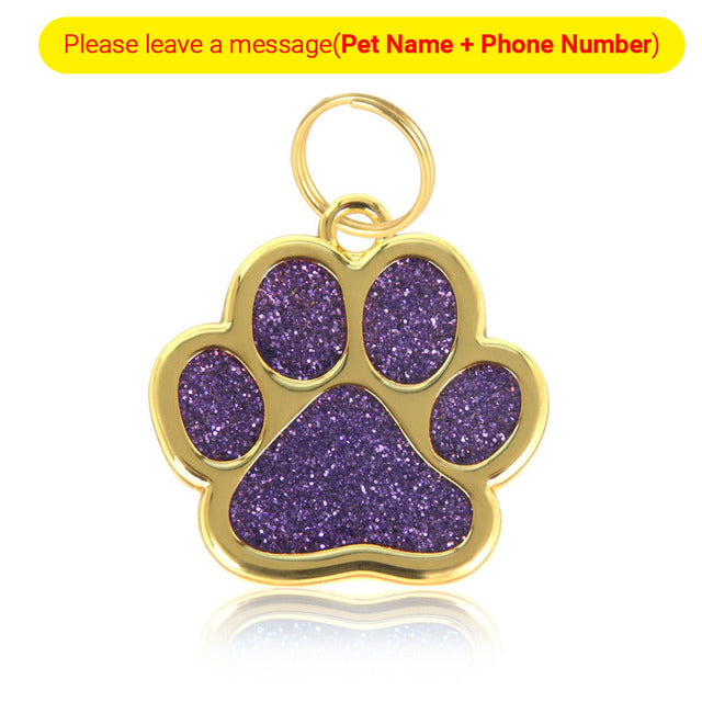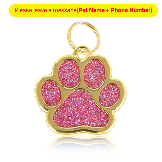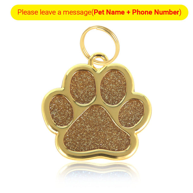 Make your furry friend stand out with a personalized collar pet ID tag! This custom engraved tag is perfect for dogs and cats and is made of high-quality stainless steel. The tag features a beautiful gold paw glitter pendant that adds a touch of glamour to your pet's collar.