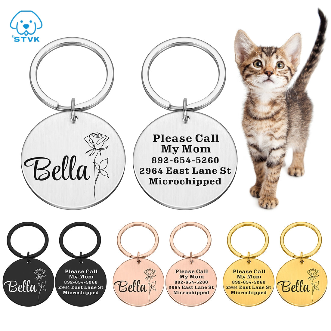 Made of high-quality stainless steel, these tags are durable and long-lasting. They come in a variety of colors and shapes, including round, to suit your pet's unique personality. Choose from rose gold, gold, silver, or black to match your pet's collar or your own personal style.