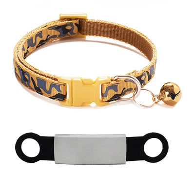 This is a personalized nylon collar for cats and small dogs that comes in a camouflage print and can be custom engraved. It includes bells and a breakaway feature, and is adjustable in size from 7-12 inches. The collar is available in green, red, pink, blue, and yellow and is made from high quality nylon.