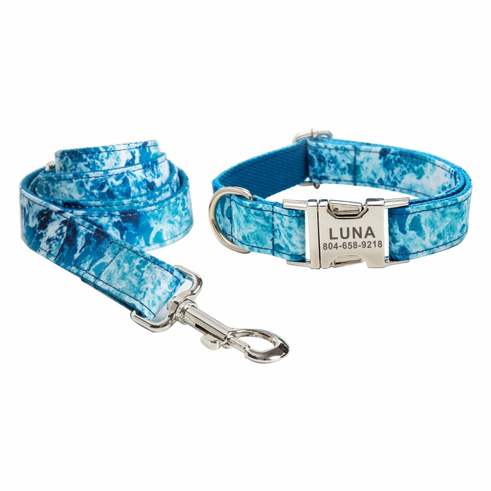 Personalized Sea Wave Pet Collar Custom Puppy Nameplate ID Tag Adjustable Buckle Blue Natural Style Basic Collars Leash Set