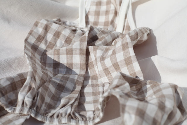 A type of pet clothing made from linen material that features a plaid pattern. It is suitable for small dog breeds like Chihuahuas and French Bulldogs, as well as cats. It is a simple and retro-style jumpsuit, and it is available for purchase as a dog supply item.