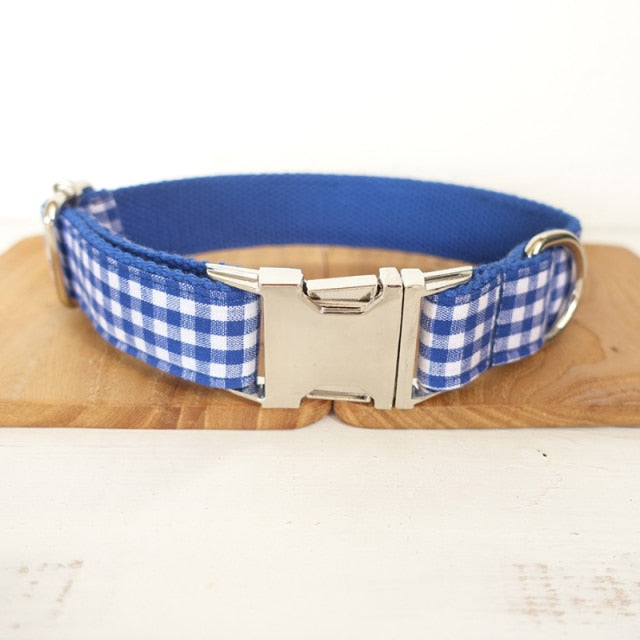 A set of personalized pet collars with a Scottish plaid pattern made of nylon material. It is available in different sizes and can be customized with the pet's name and ID tag. The collars also have a quick release feature and come with a lead leash. The engraving is free and the handling time is 4-7 days. It is suitable for all seasons and is designed for dogs.