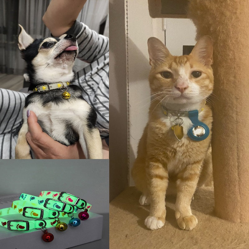 Pet collars that glow in the dark and have bells attached. They are made of silica gel and can be used for both dogs and cats. They are considered luminous neck accessories.