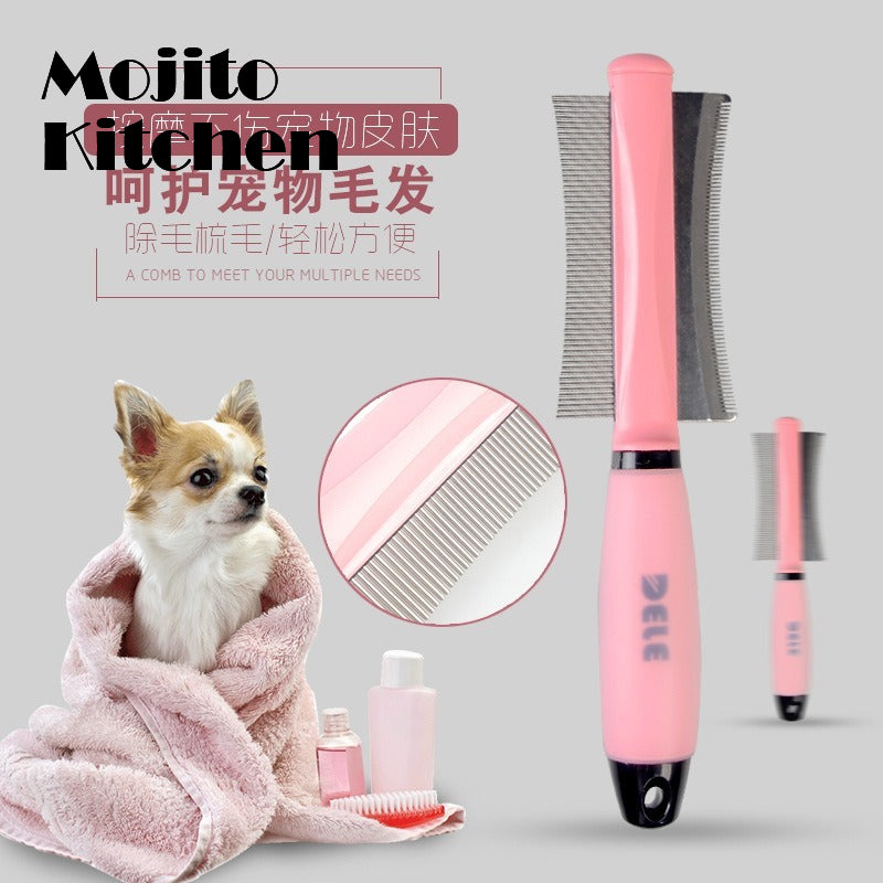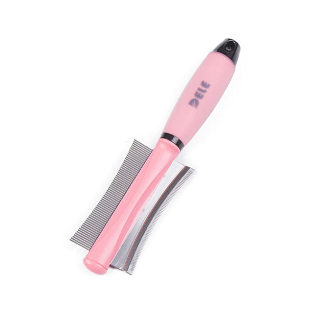 A pet hair comb for cats and dogs that is double-sided and made of stainless steel. It comes in pink and blue and is suitable for pets with long, curly hair. It is a grooming tool that helps remove hair and prevent hair knotting while also promoting blood circulation and timely detection of trauma and skin diseases. The comb reduces the amount of hair loss and can be used for grooming, massaging, and bath cleaning.