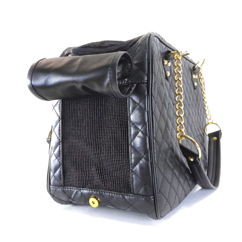 A pet carrier bag designed for small dogs and cats. It is made of PU material and has a zipper closure. It is a shoulder bag that can be used for travel and hiking. It is also approved for airline travel.