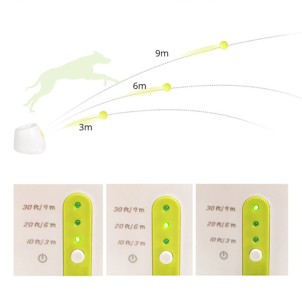 A plastic interactive toy set for dogs that includes an automatic tennis launcher machine device with a range of 3, 6, or 9 meters and comes with three balls for training.