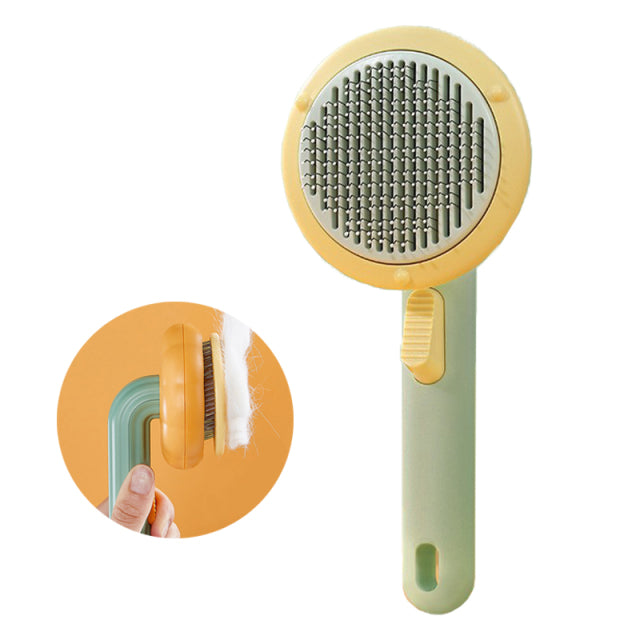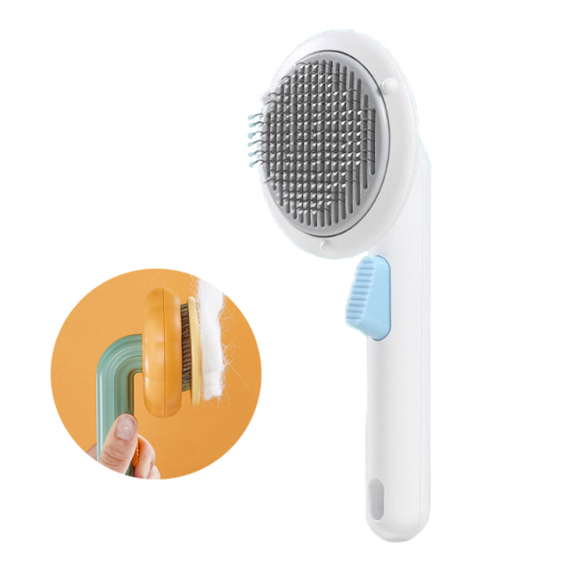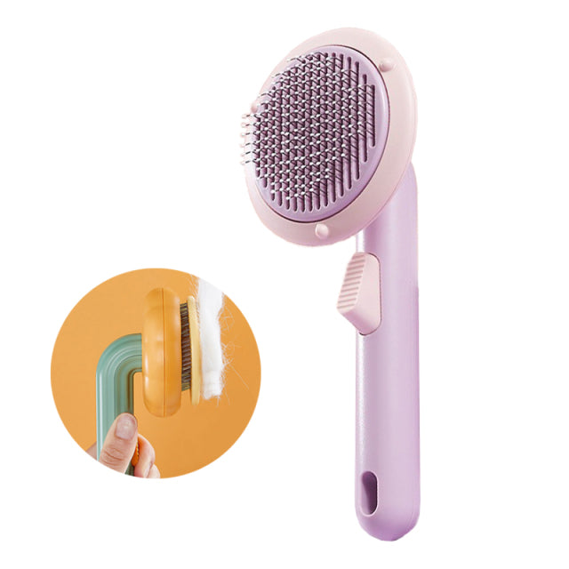 A self-cleaning slicker brush made of plastic that is designed for cats and dogs. It helps remove undercoat tangled hair and massages particles to improve circulation. It is a pet comb that can be used for both dogs and cats as a tool and a massage comb.