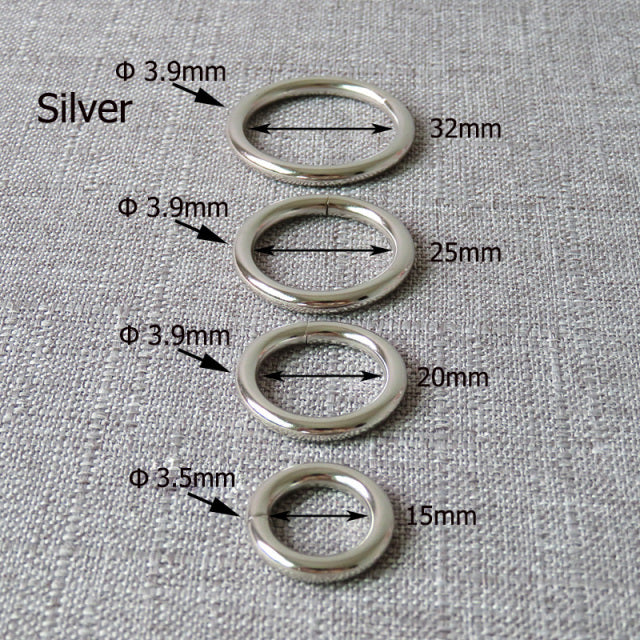 A metal O ring buckle that can be used for various purposes such as bags, belts, garments, and shoes. It is made of iron and has a plated finish. The buckle comes in different sizes with an inner diameter of 15mm, 20mm, 25mm, and 32mm. It weighs between 6g to 10g and is silver in color. The product is sold in bulk packaging and is not customized.