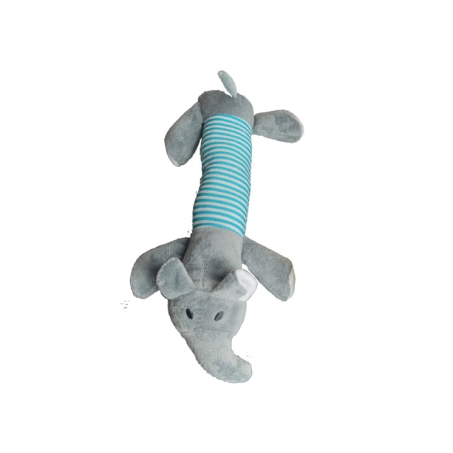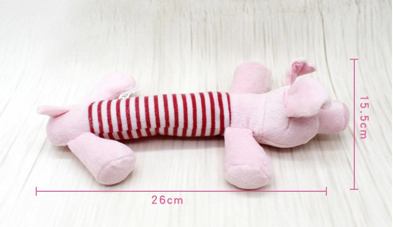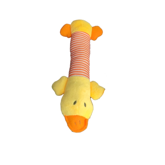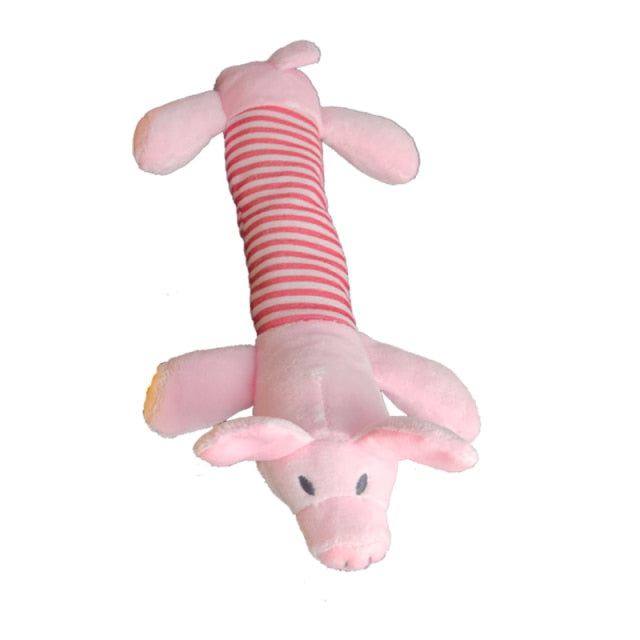 A soft plush toy for dogs and cats that can help with stress and tooth cleaning. It comes in three animal choices (pig, duck, or elephant) and makes a squeaking noise. It is made of plush, PP cotton, and a BB whistle and is 26*15.5cm in size and weighs 25g. It is suitable for both cats and dogs.
