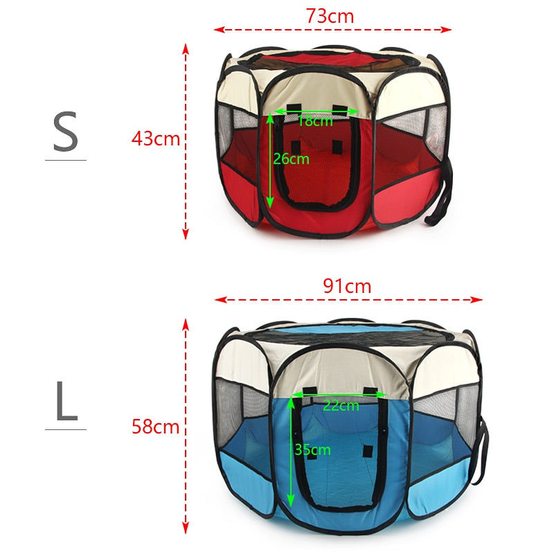 This pet tent is suitable for medium and large dogs and cats, with sizes ranging from S:74*74*43CM to M:91*91*58CM. It's a versatile product that can be used as a playpen, kennel, or even a tent for outdoor adventures. The tent's design is octagonal, providing your pet with plenty of space to move around and play.