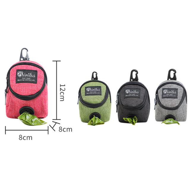 A multifunctional dog snack bag that can be worn around the waist. It is made of durable cation material and has a large capacity for storing pet supplies. It is available in green, black, pink, and gray and has a solid color pattern. It is suitable for all seasons and is windproof. Its dimensions are 12*8*8cm.
