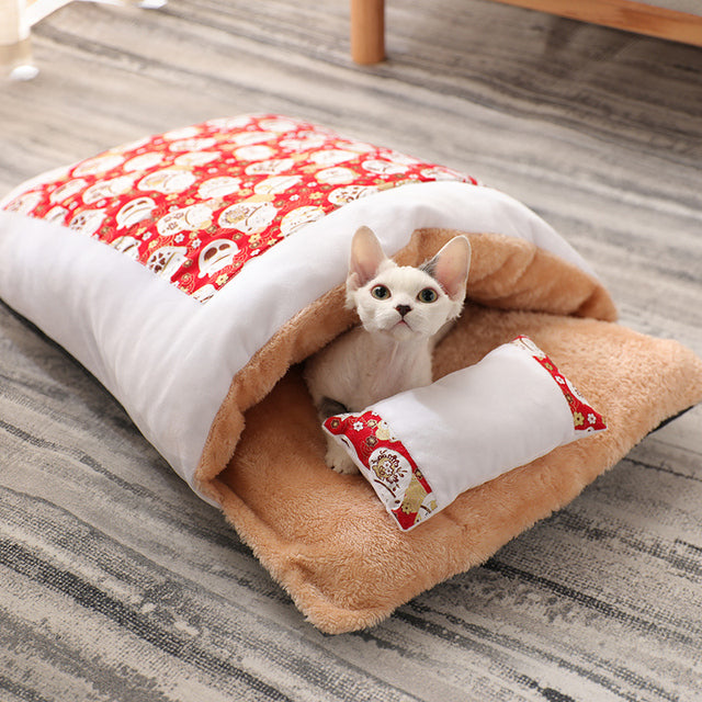 Introducing our Cute Cat Bed Warm Cat Sleeping Bag Deep Sleep Cave Winter Removable Pet House Bed for Cats Dogs Nest Cushion with Pillow! This adorable cat bed is made of high-quality coral fleece material, ensuring maximum comfort and warmth for your furry friend during the colder months.