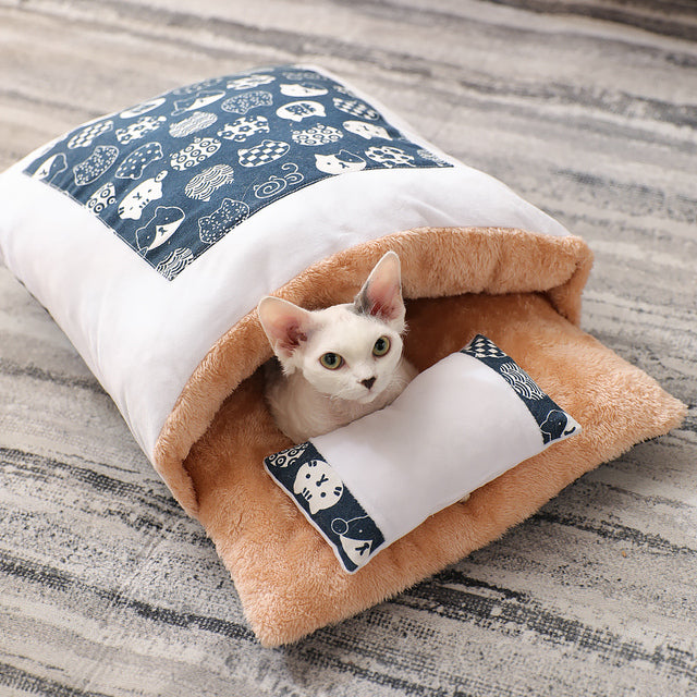 Cute Cat Bed Warm Cat Sleeping Bag Deep Sleep Cave Winter Removable Pet House Bed for Cats Dogs Nest Cushion with Pillow