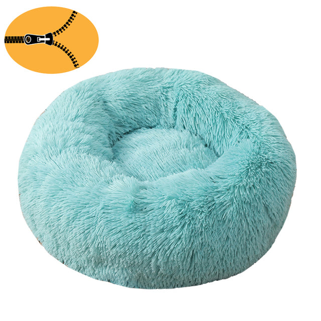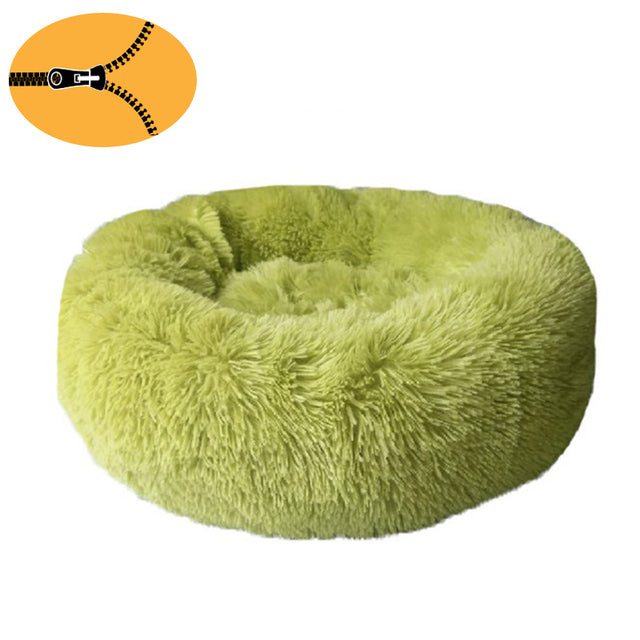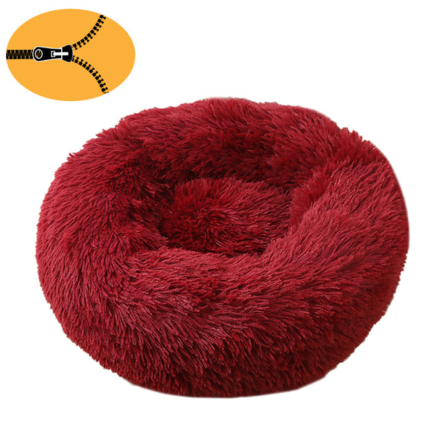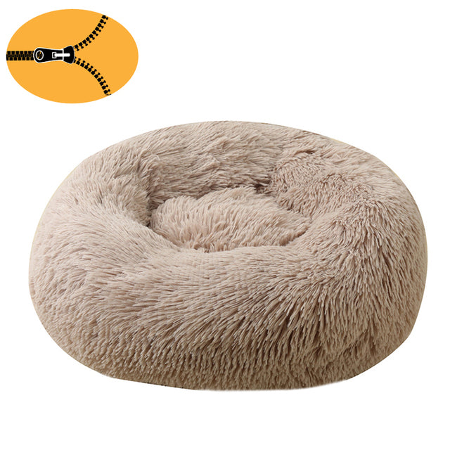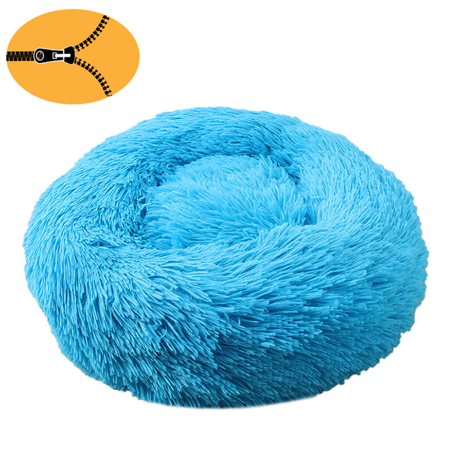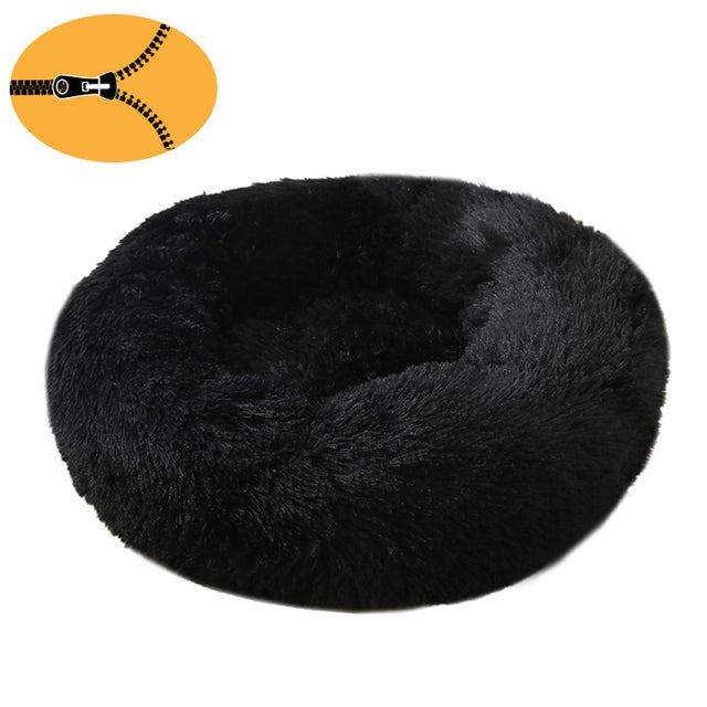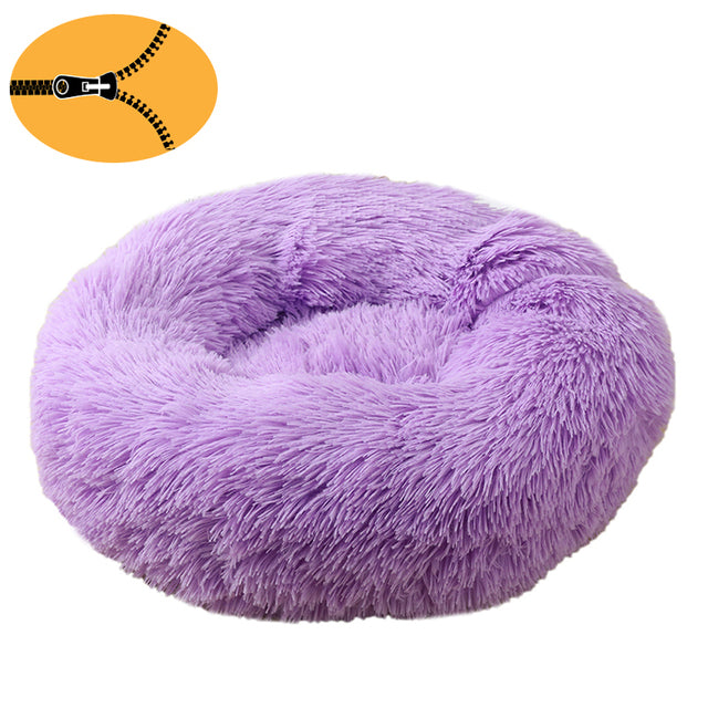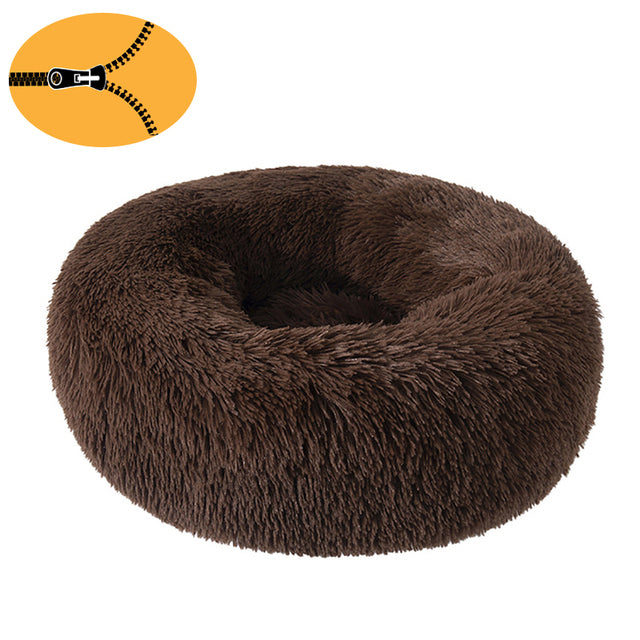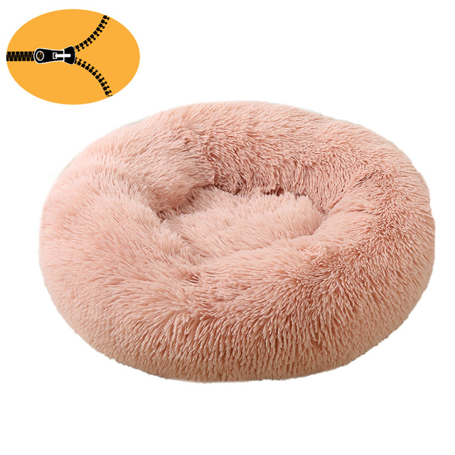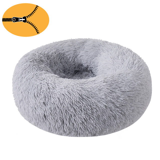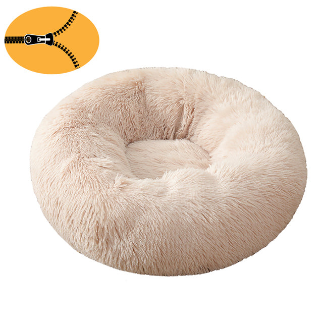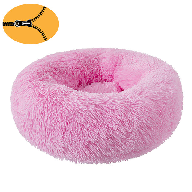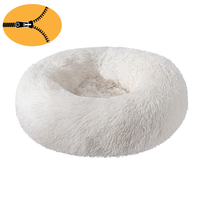 A pet bed for dogs and cats with a round donut design. It is made of soft plush material and is warm and comfortable for pets during the winter. The cover is removable and the bed can be washed in a machine. It is made of faux fur and is available in a solid color. It is not a smart device.