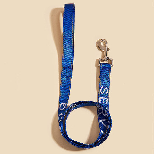 A leash for dogs that can be used for running, walking, and training. It is made of nylon and has a neoprene handle. The leash is embroidered with the letters "Service Dog" and is reflective for safety. It also has a quick release and is padded for comfort. The leash comes in red and blue colors and is suitable for use in all seasons.