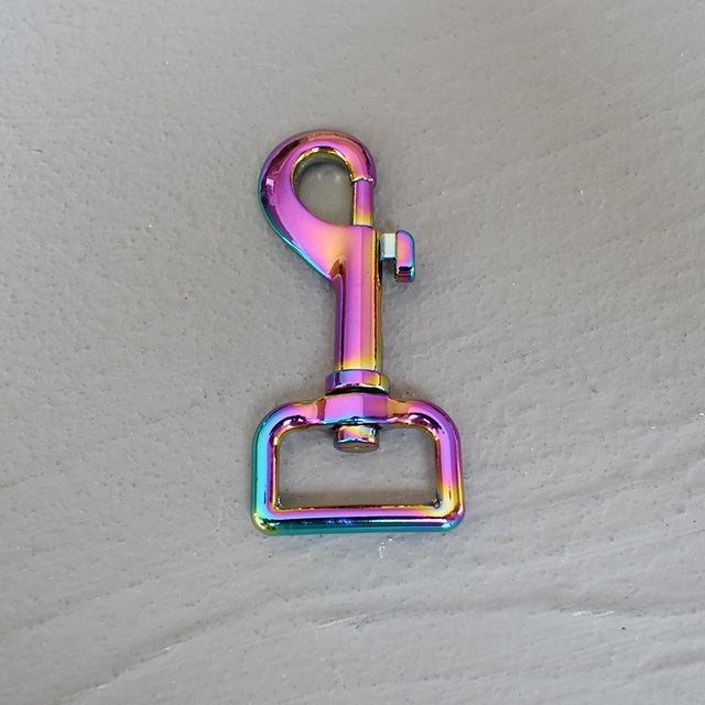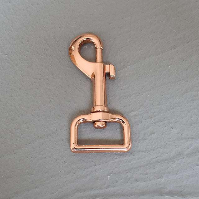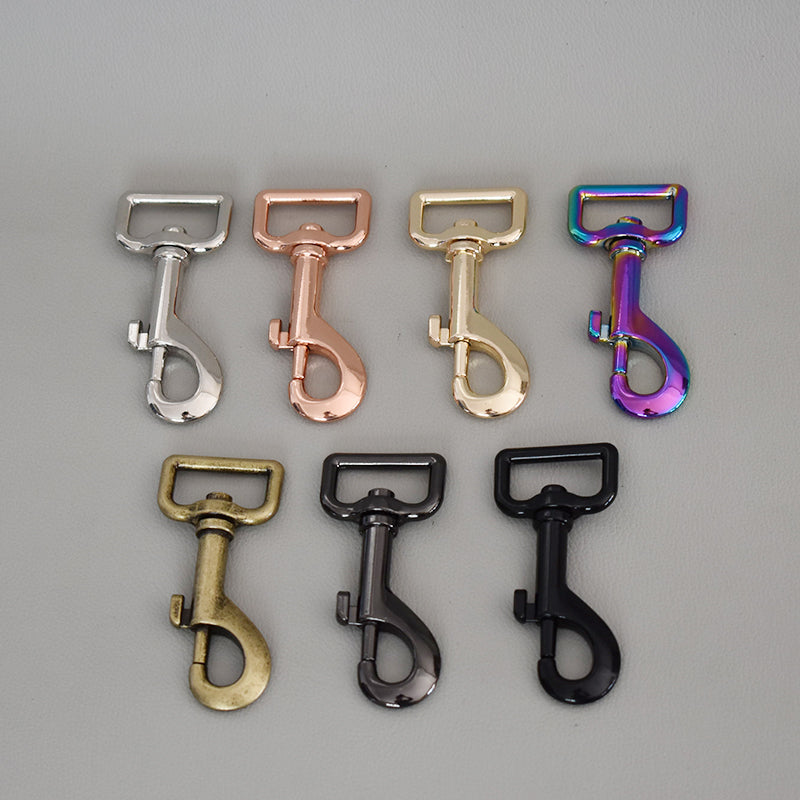 A metal swivel lobster clasp hook buckle that is durable and made of zinc alloy. It has an inner diameter of 25mm and weighs 35g/pcs. It can be used for bags, belts, garments, and shoes, and is suitable for DIY dog leash parts, leather bags, crafts, and pet collars. It comes in various colors including rose gold, gold, black, silver, gun black, and antique brass. The product is sold in packages and large quantities can be ordered.