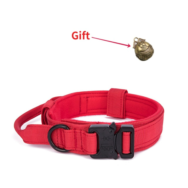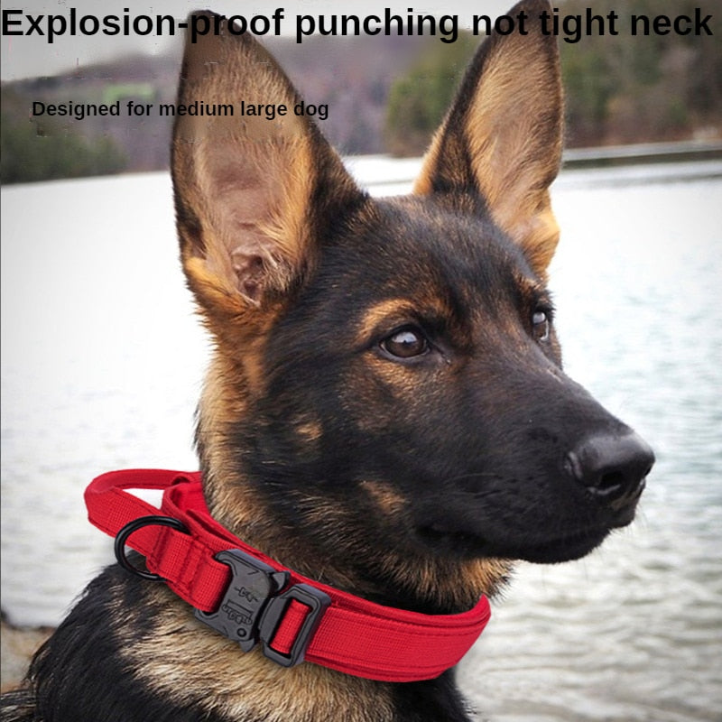 A Tactical Dog Collar Leash Set made of nylon, suitable for medium to large dogs such as German Shepherds. The collar is adjustable and comes in various colors including red, cyan, black, pink, nickel, army, and cp. It features a breakaway feature and is suitable for all seasons. The material used is imitation nylon. The collar is categorized under basic collars and comes in sizes M, L, and XL.