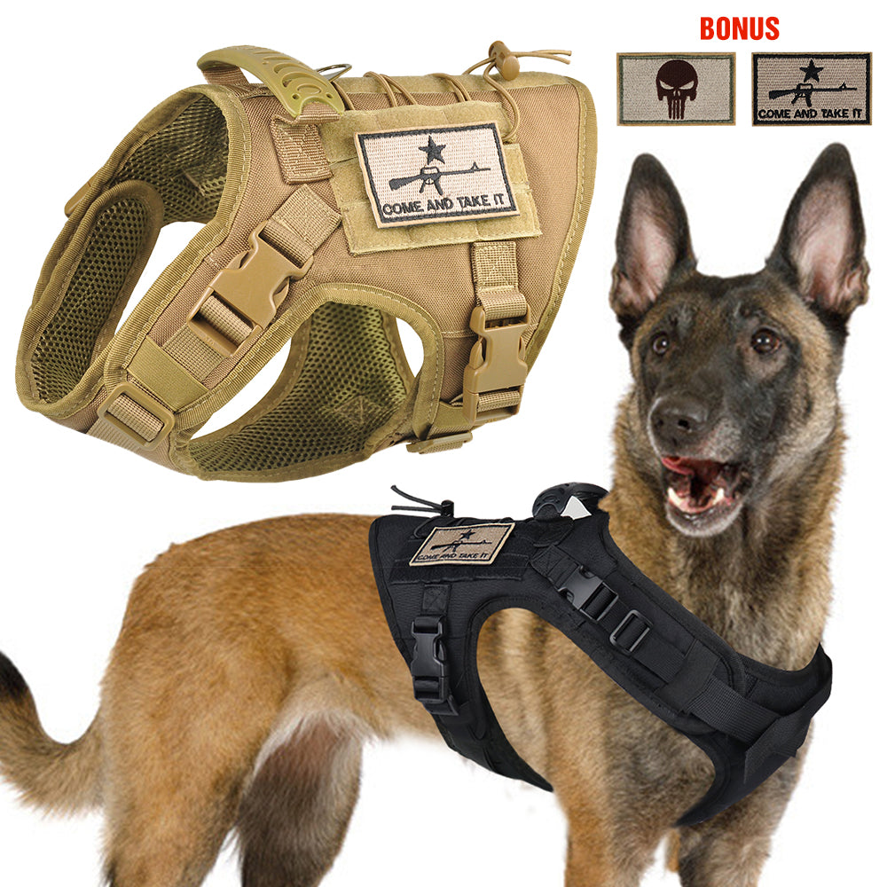 A dog training harness made of nylon material that is suitable for all seasons. It is adjustable and features a rubber handle and military MOLLE design.