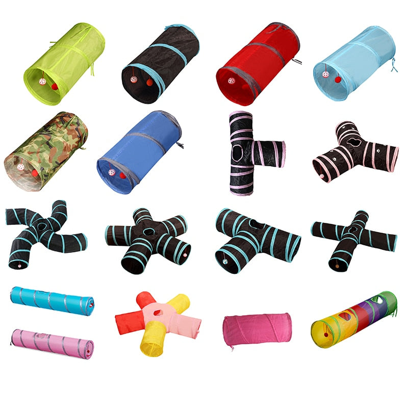 A pet toy that is a foldable tunnel for cats, puppies, kittens, and rabbits to play and train in. The material is cloth and it comes in different sizes. The toy features include a cat tunnel tube, a play tunnel, a training tunnel, and cat toys such as mouse balls. It is an interactive toy for cats and rabbits, and can also be used as rabbit toys.