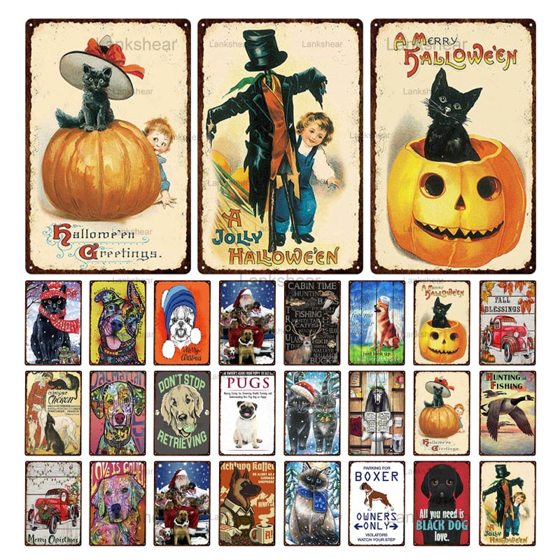 Vintage Animal Cute Dog Cat Metal Poster Tin Signs Wall Plaque Pet Shop Home Bar Pub Decor Retro Plate Halloween Christmas Decor