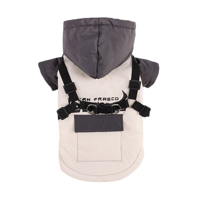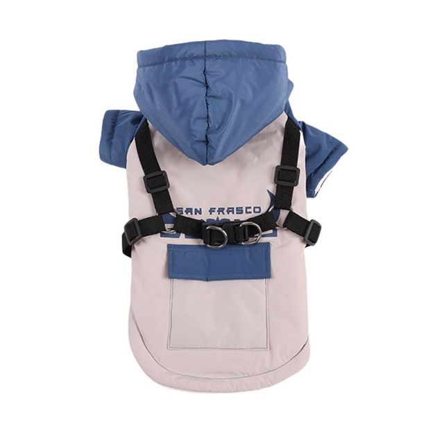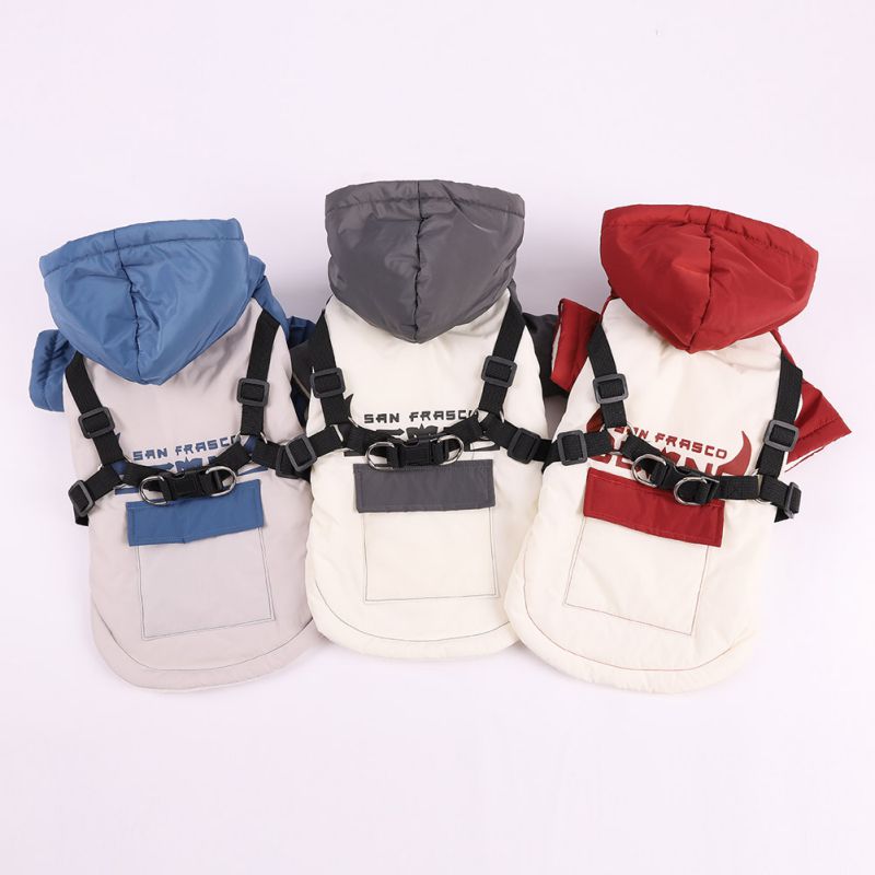 A warm dog coat with a built-in harness, suitable for autumn and winter seasons. It is made of 100% cotton and comes in solid colors. The coat is waterproof and has buttons for easy wear. It is designed for small dogs and puppies for outdoor activities.