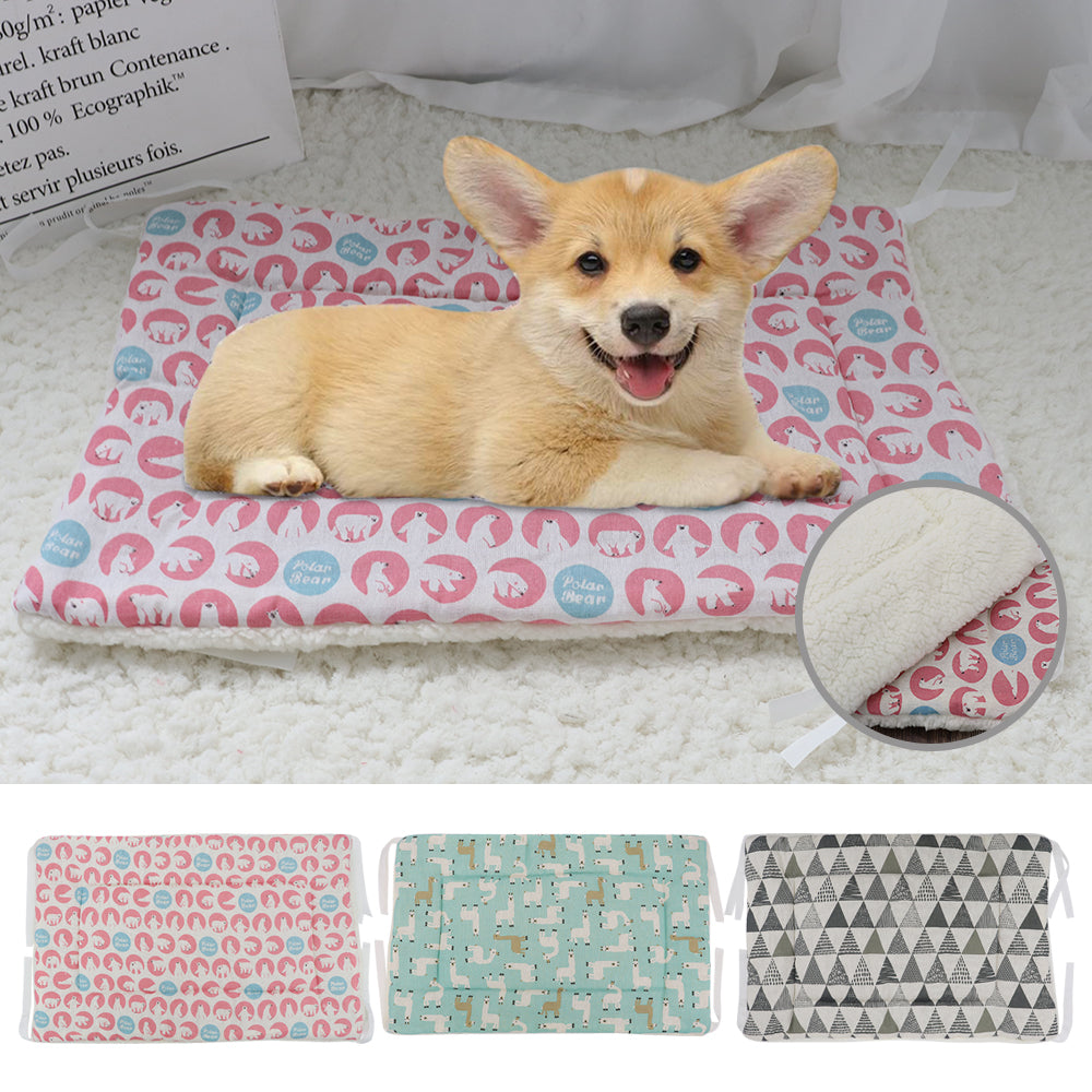A warm and soft pet bed mat made of fleece and polyester. It is suitable for small to medium-sized dogs and cats and comes in different colors and sizes. It can be hand washed and is suitable for use both indoors and outdoors during the spring, autumn, and winter seasons.