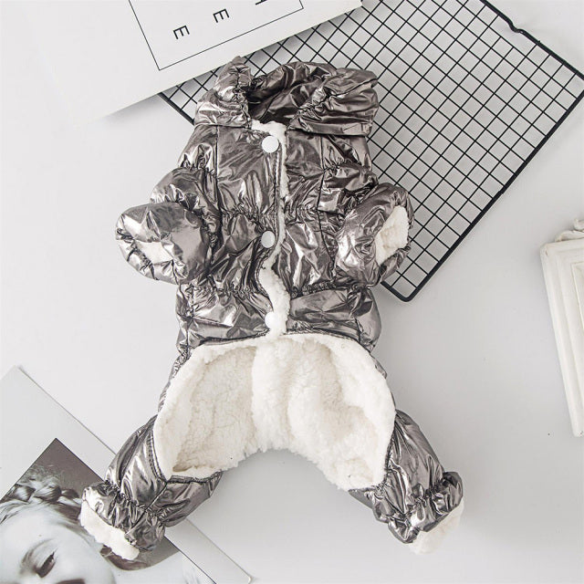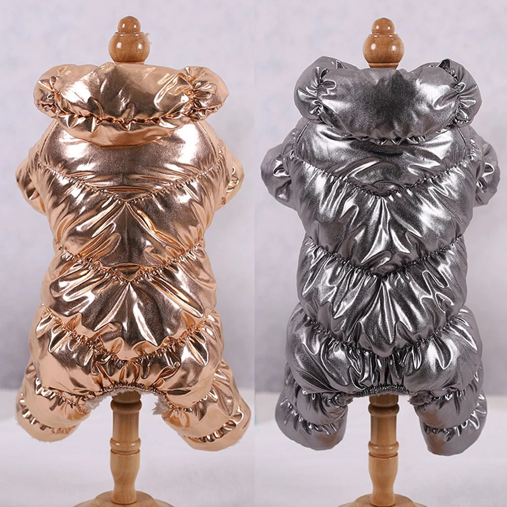 A line of dog clothes designed for the autumn and winter seasons. The clothes are made of 100% cotton and are available in sizes XS to XXL. They come in solid colors of gold and silver and are suitable for small to medium sized dogs. The clothes are waterproof and thick to provide warmth and comfort to pets. The product is a dog coat jacket.