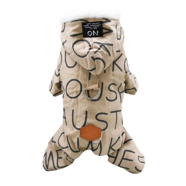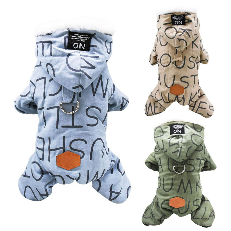 A winter clothing item for dogs, specifically small to medium sized breeds like Chihuahuas. It is a windproof coat with a hood and jumpsuit style, and features a letter pattern.